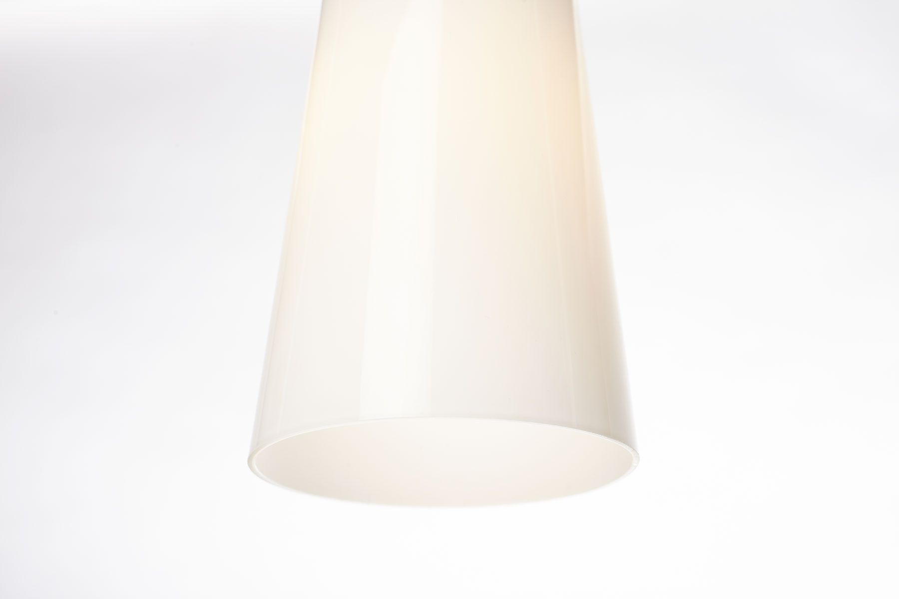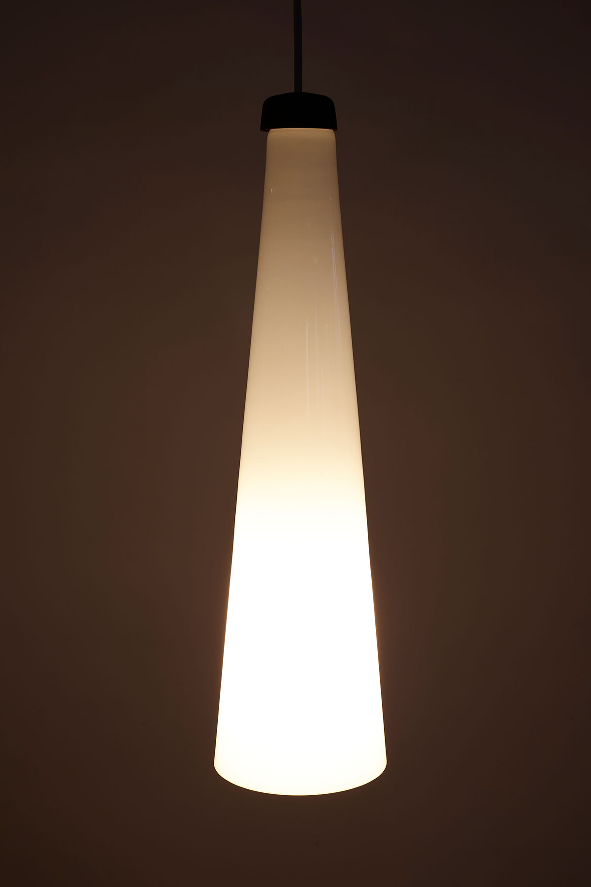 With its elegant conical shape and teak top, this pendant light embodies timeless style. Featuring handblown glass and beautifully grained teak wood, it is truly a unique piece. Sourced from the home of a Danish architect in Odense, the producer remains unknown, making it potentially one-of-a-kind or an exceptionally rare find.
