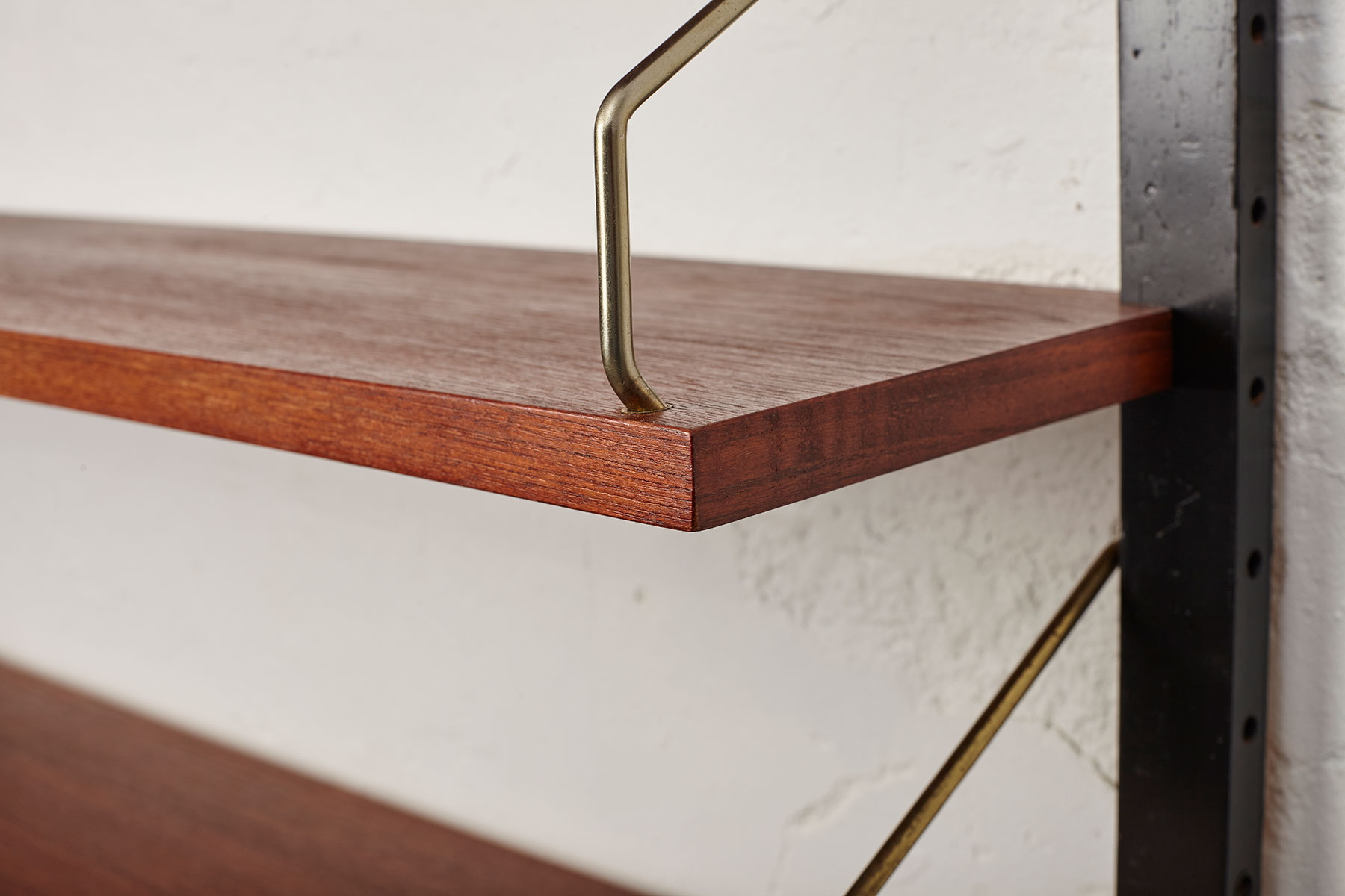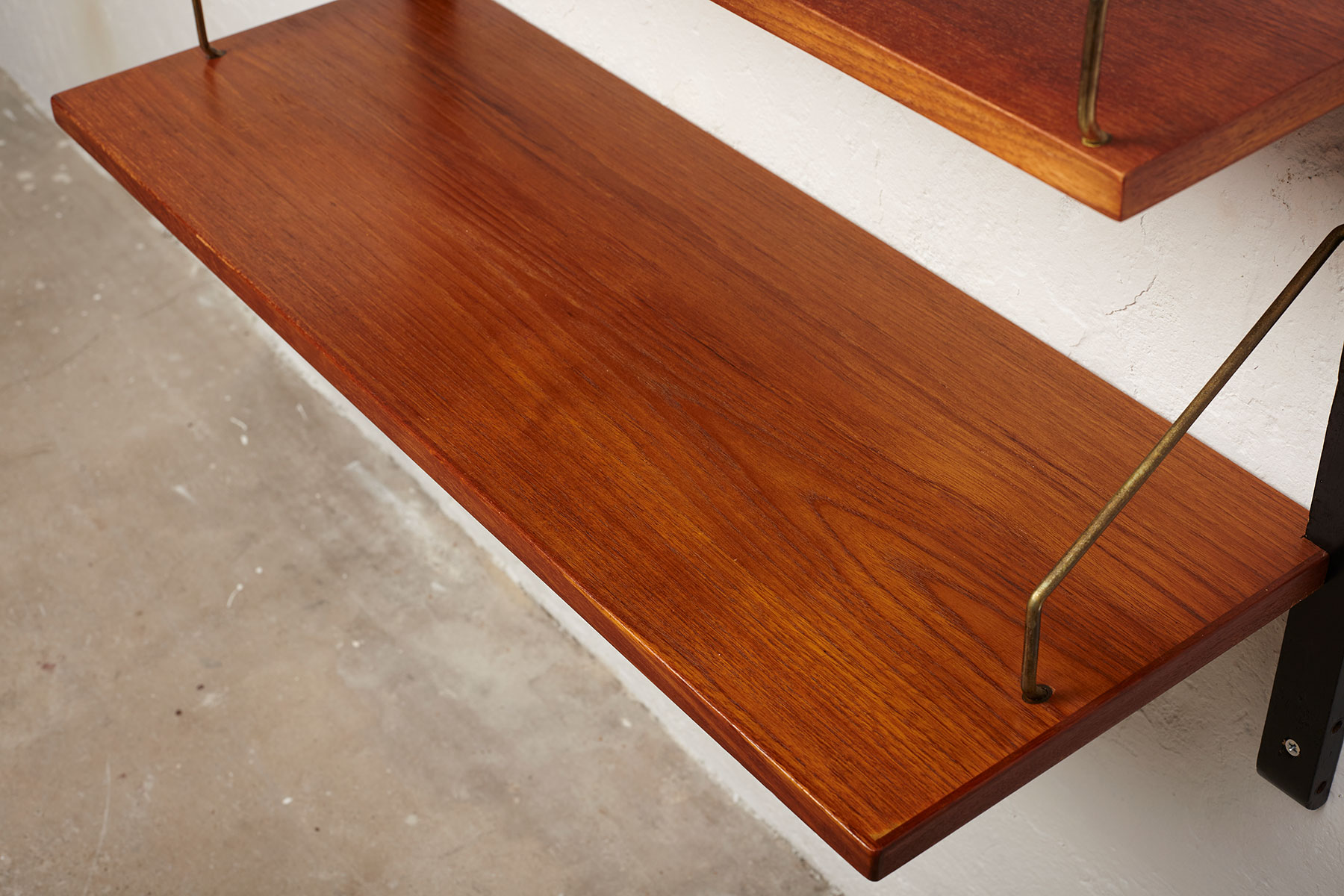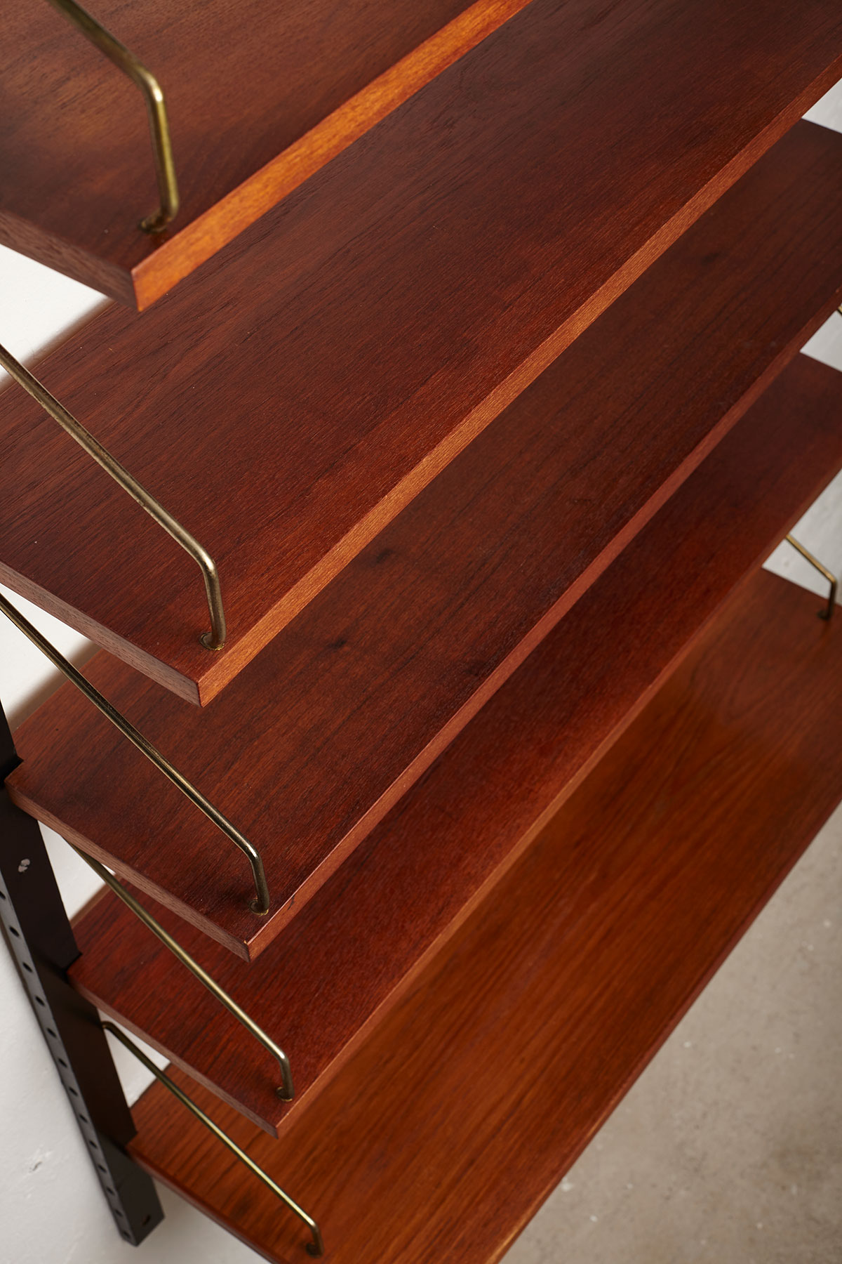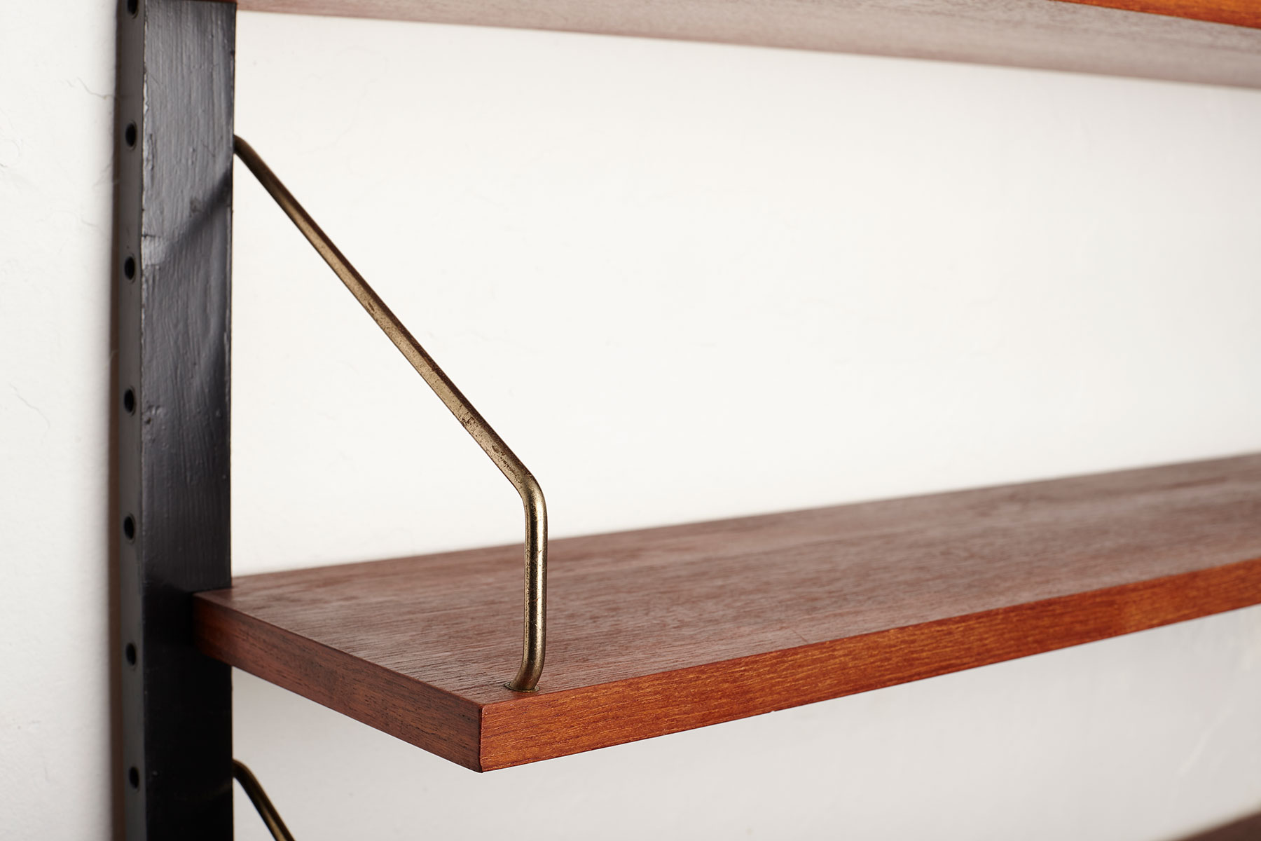 The shelves are made of teak veneer with solid brass hangers, while the solid beech wall brackets are painted black.