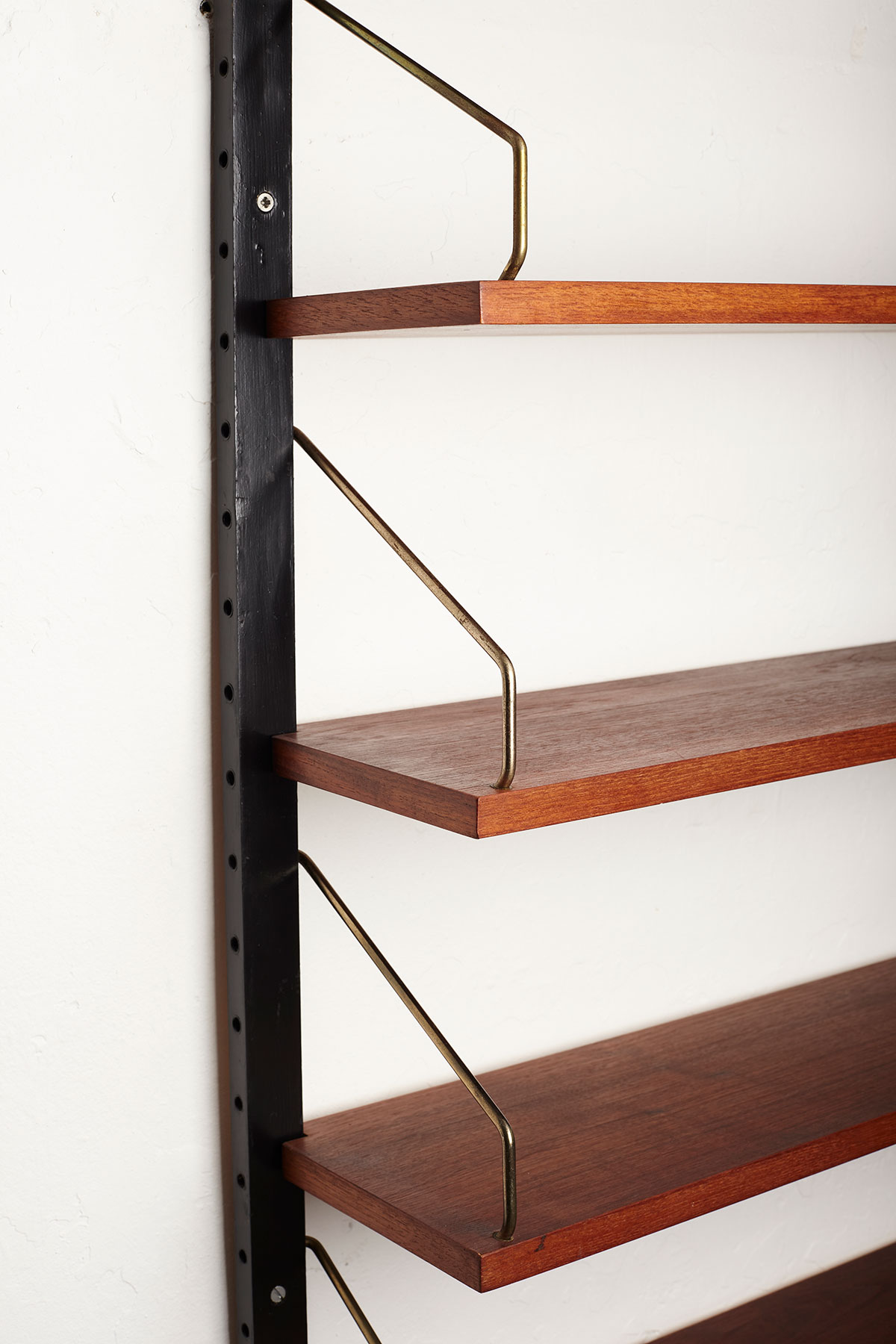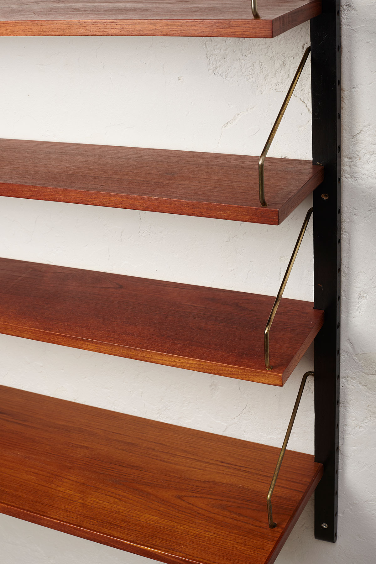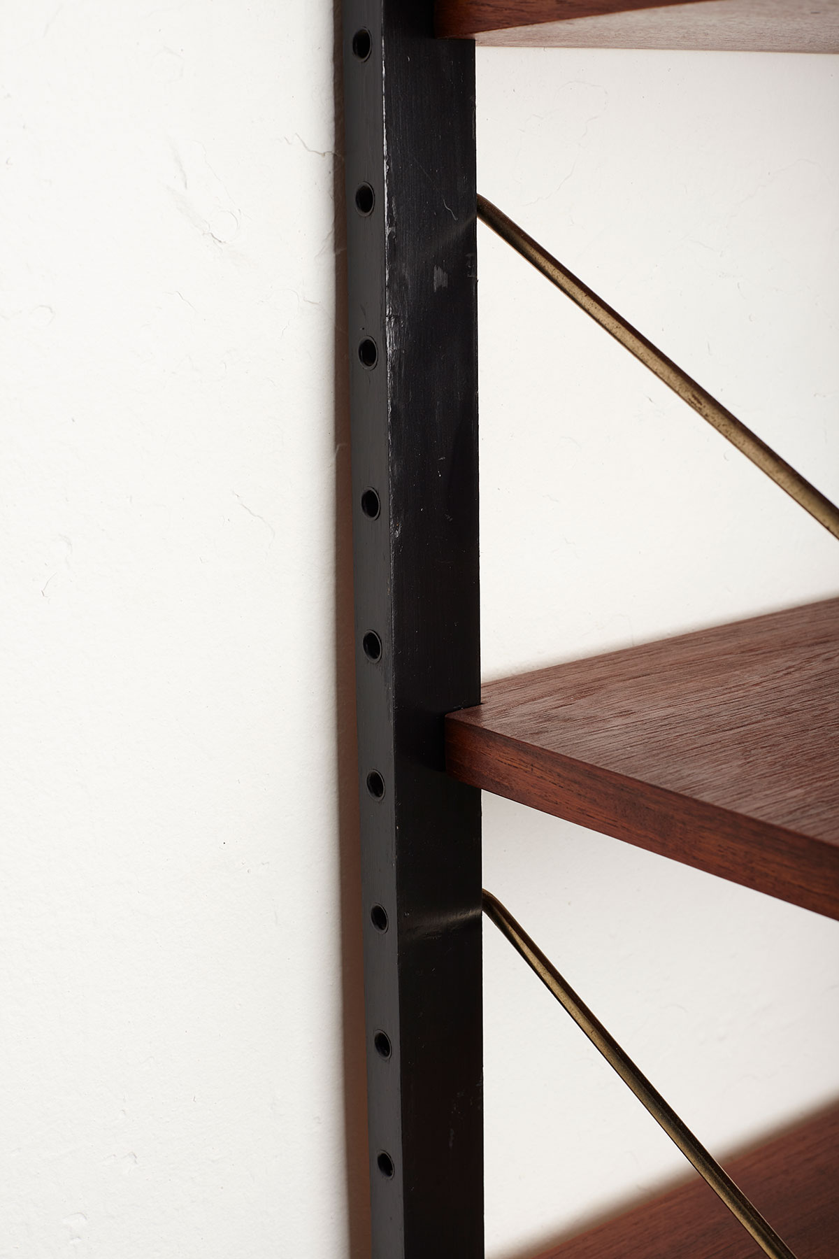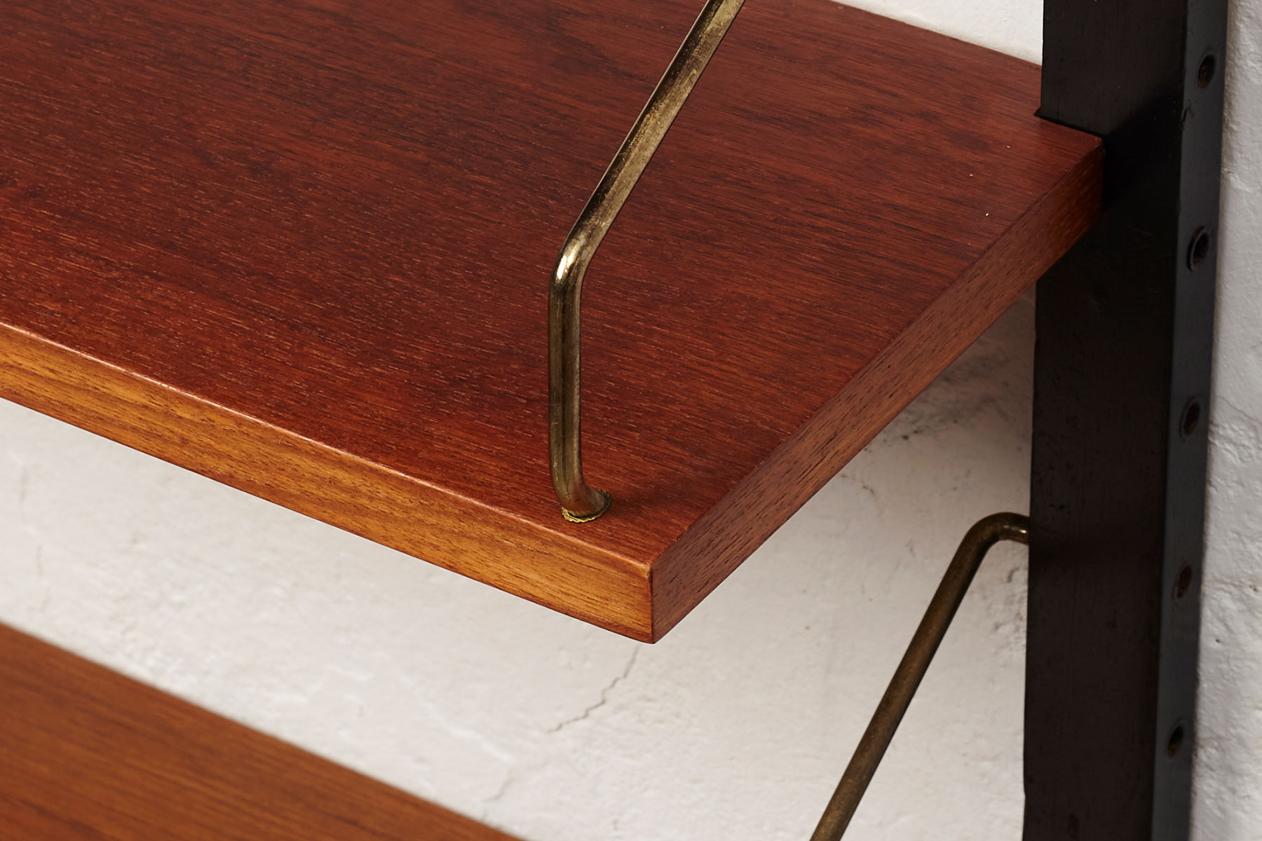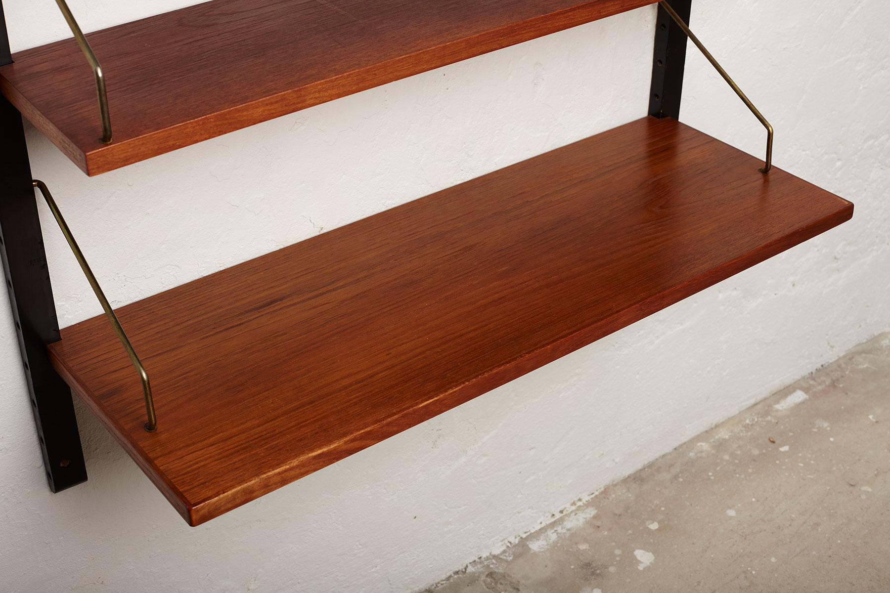 The shelves are made of teak veneer with solid brass hangers, while the solid beech wall brackets are painted black.