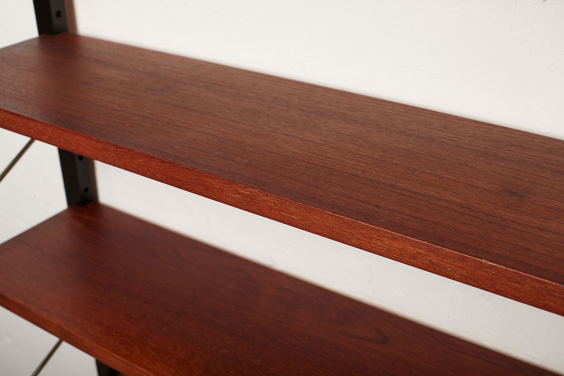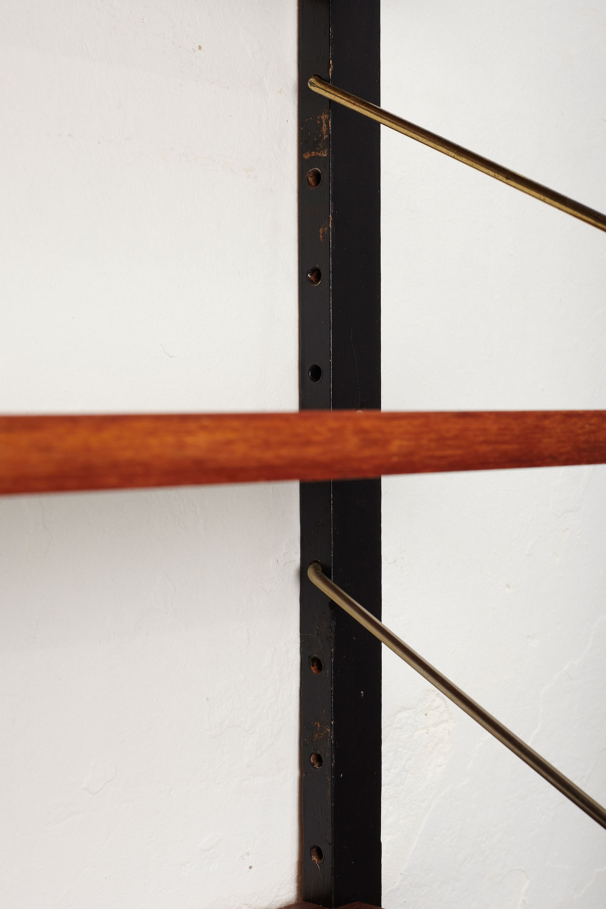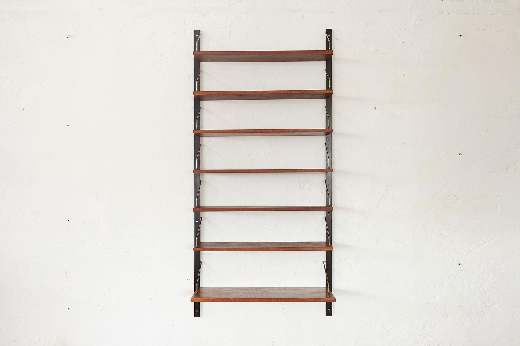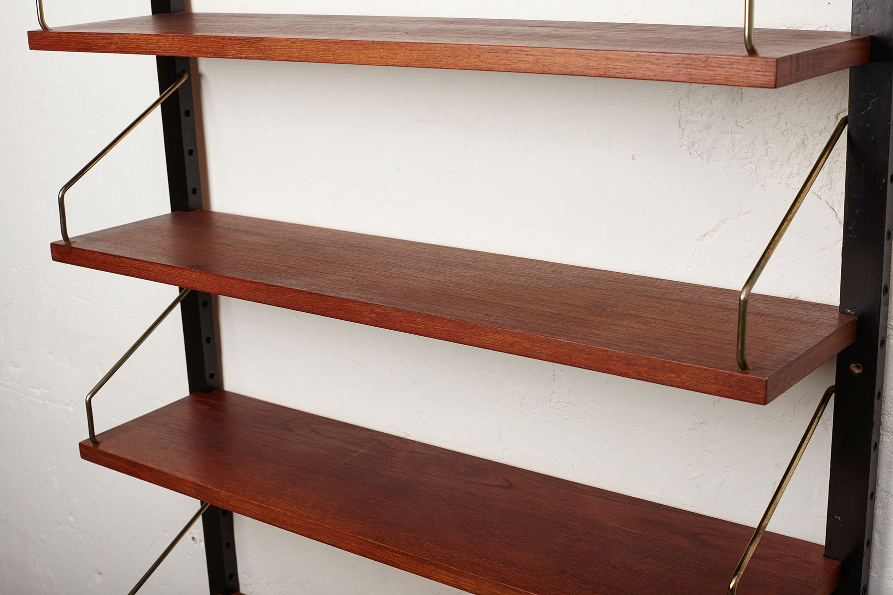 The shelves are made of teak veneer with solid brass hangers, while the solid beech wall brackets are painted black.