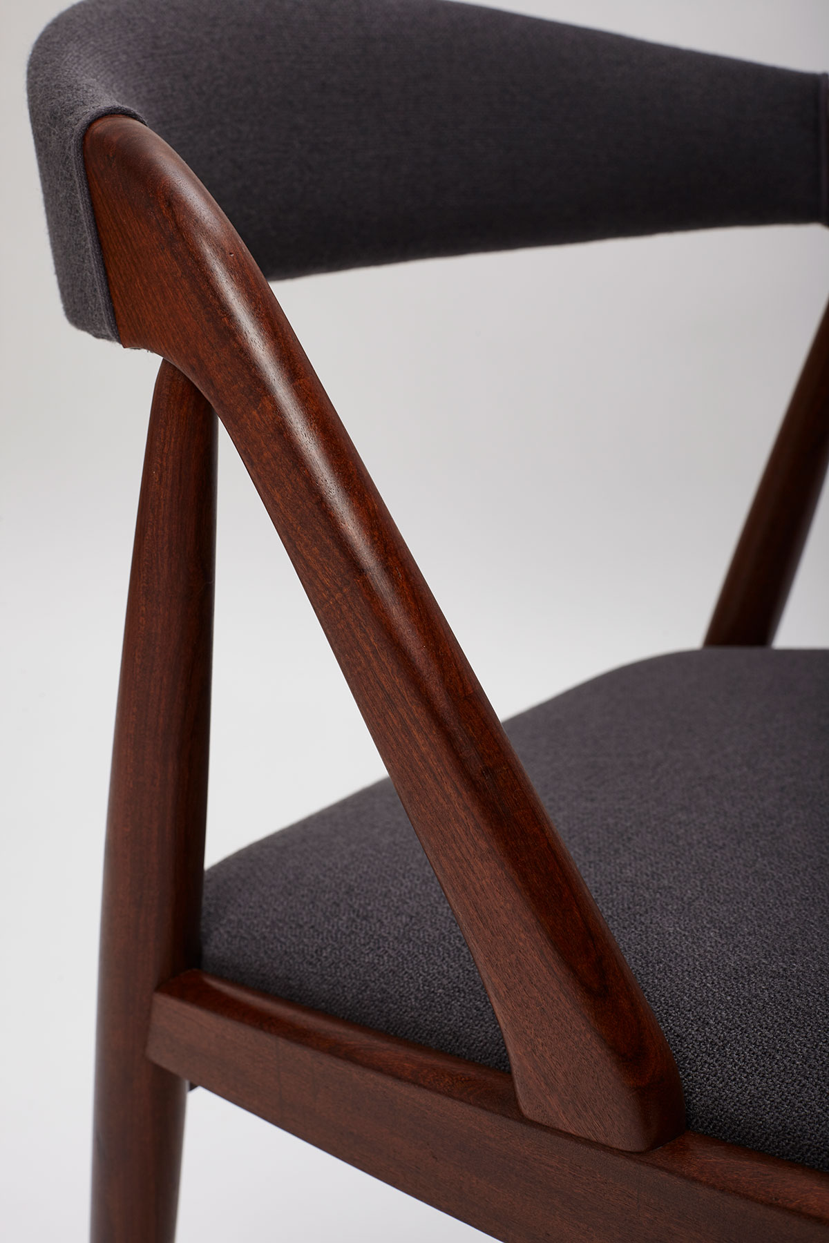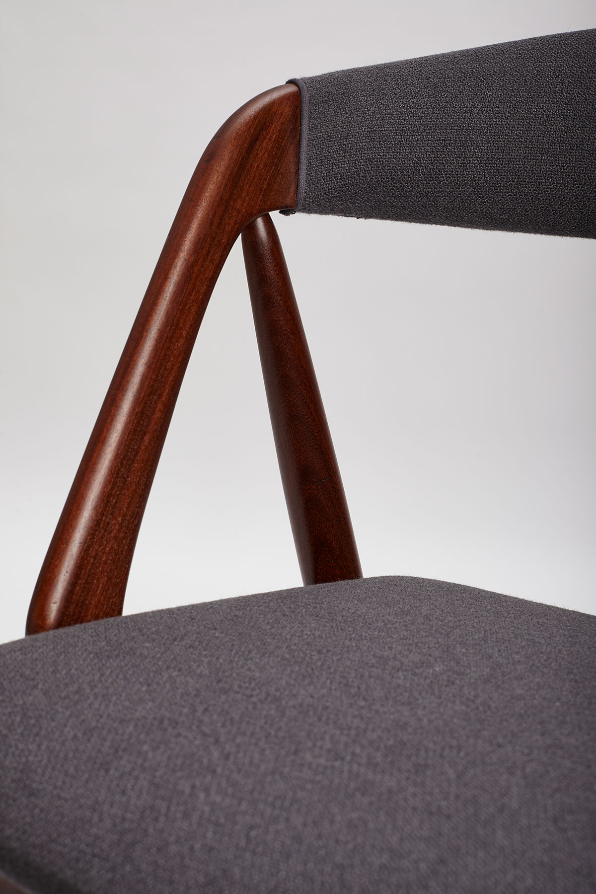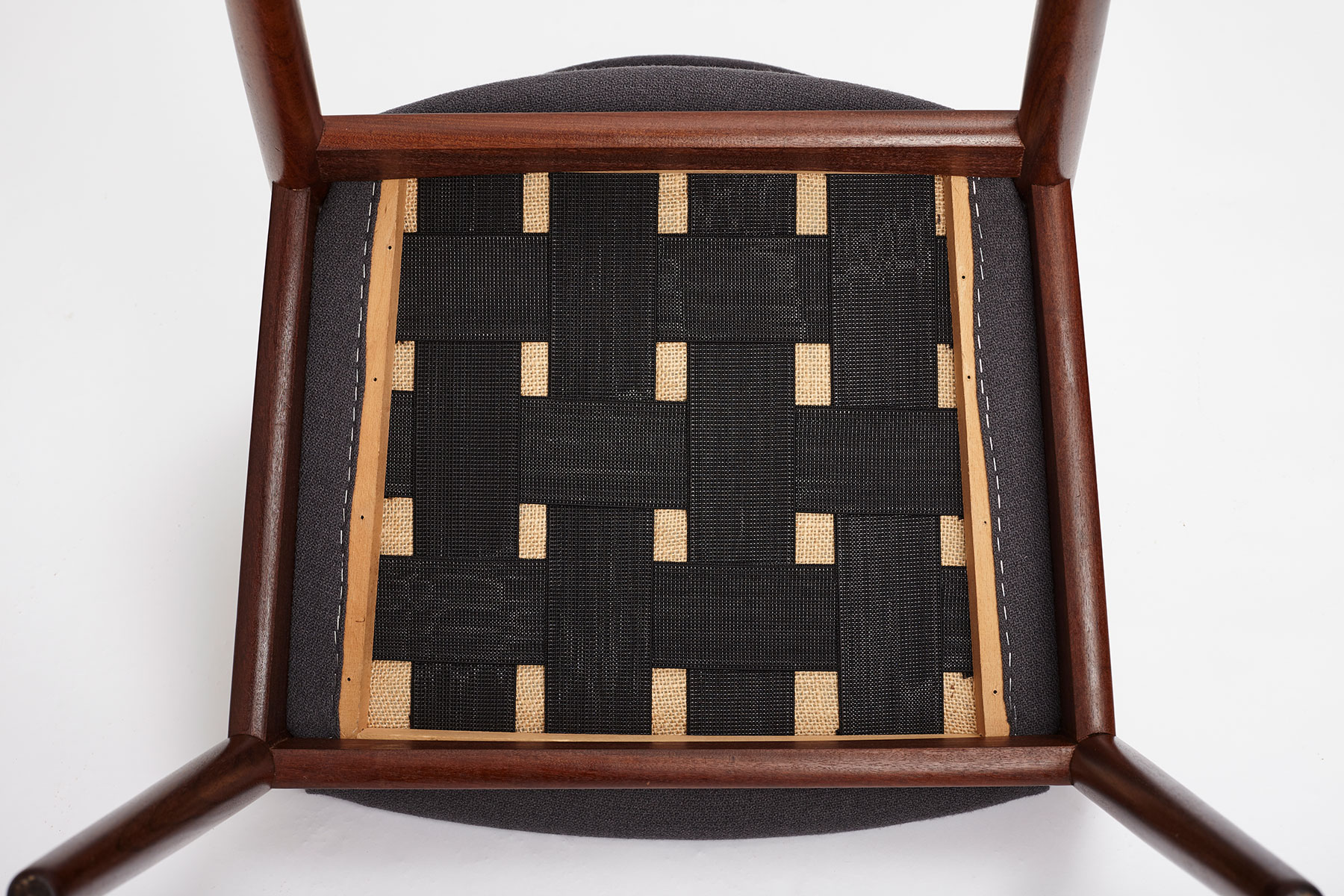 Beautiful solid teak frames with slanted back legs and curved backrests. The frames have been thoroughly cleaned, lightly sanded, oiled with a high quality teak oil and finished with a natural beeswax. All foam and seat webbing has been replaced and reupholstered in a high quality wool fabric, Koksdal 160 from Gudbrandsdalens Uldvarefabrik.
