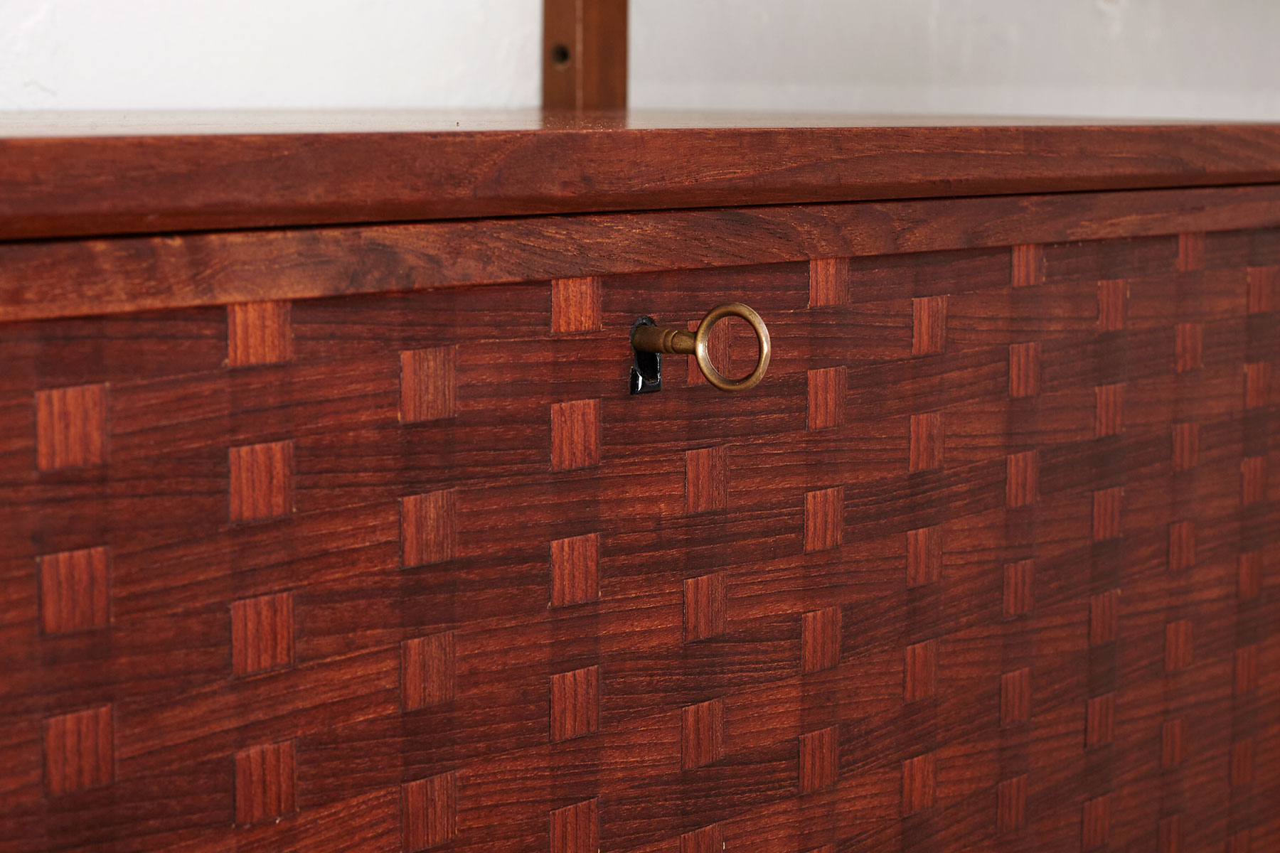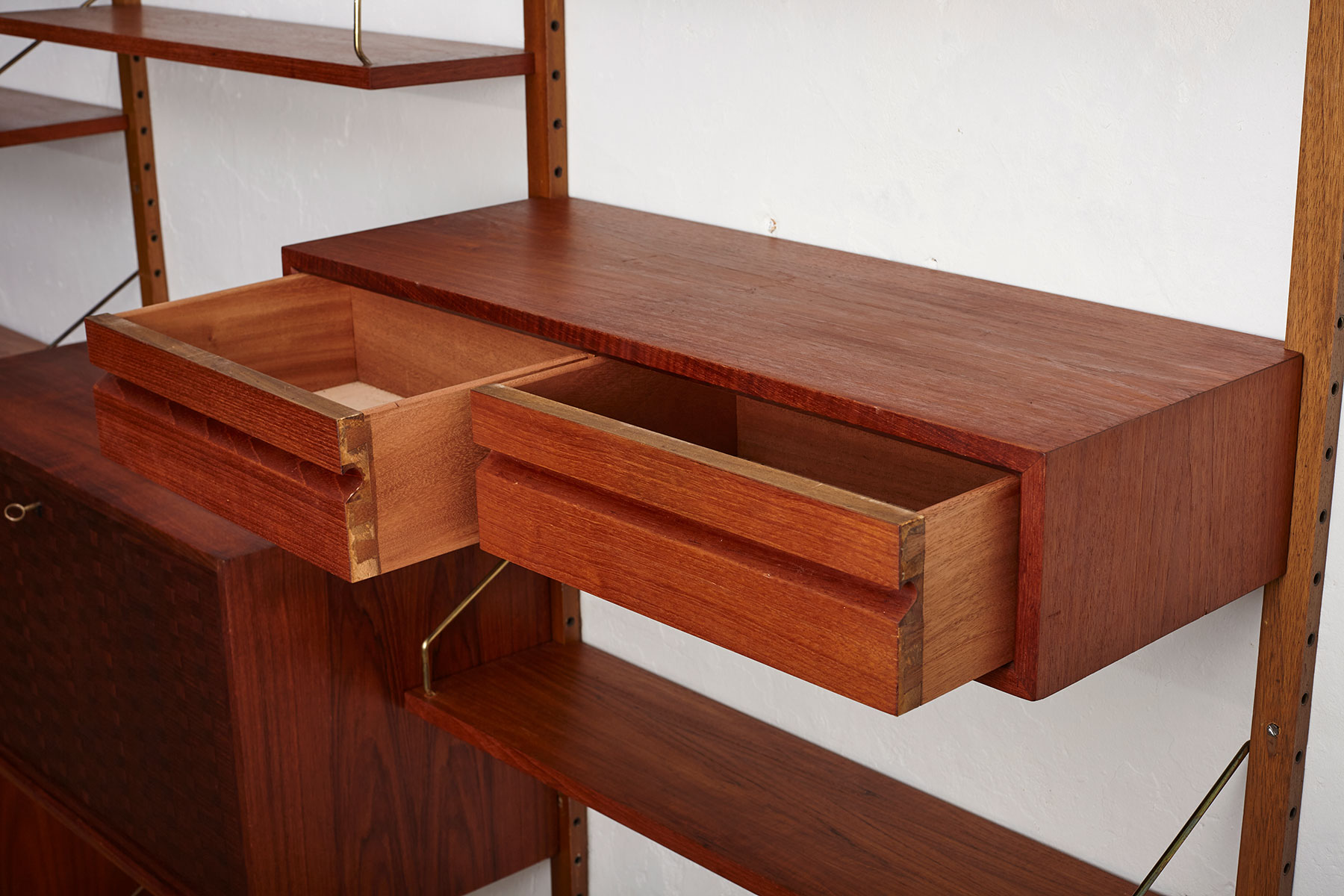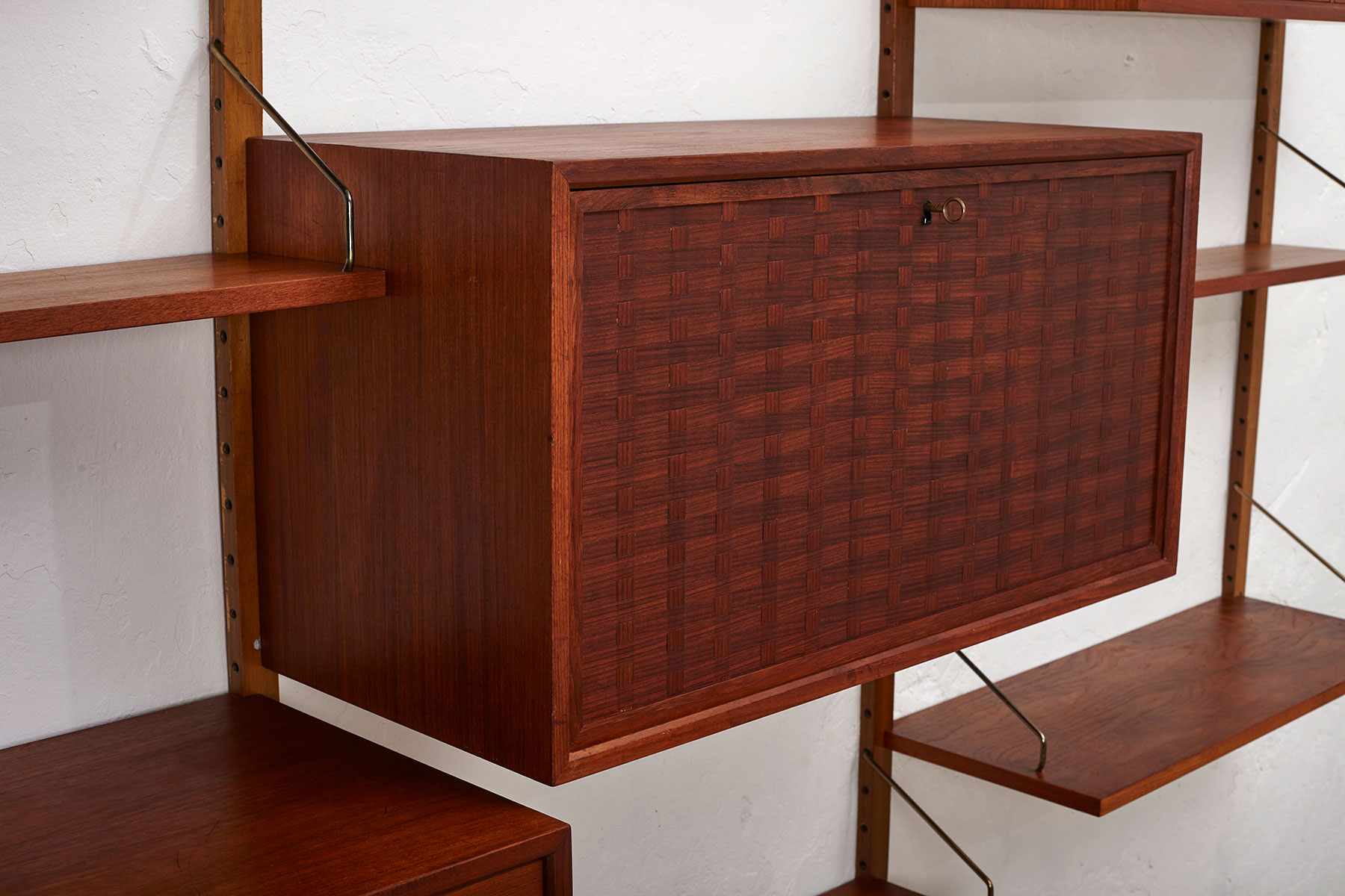 This unit includes three cabinets—one large with four drawers and one smaller with two drawers. The bar cabinet has a drop-down door with woven teak veneer details and comes with its original brass key. The system also includes seven shelves measuring 80cm x 20cm and one larger shelf (80cm x 31cm) that can be used as a small desk area.