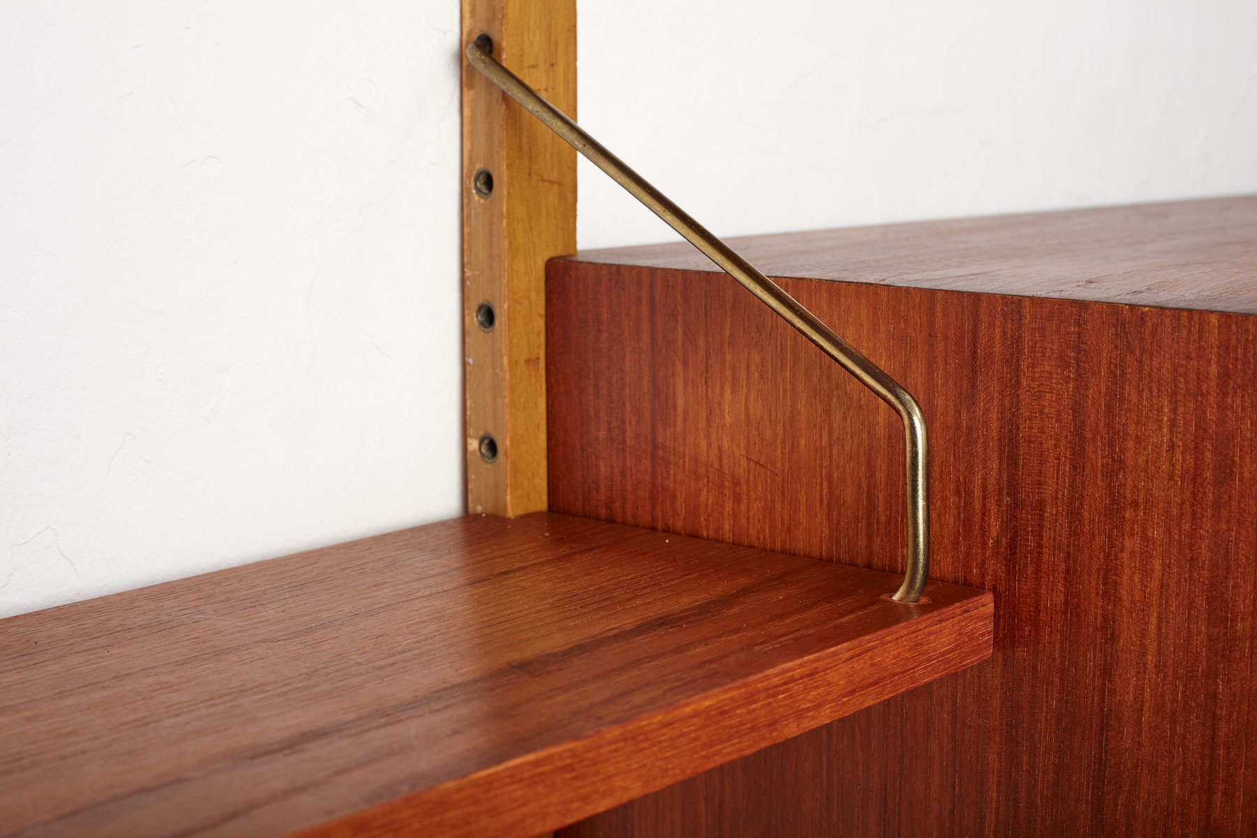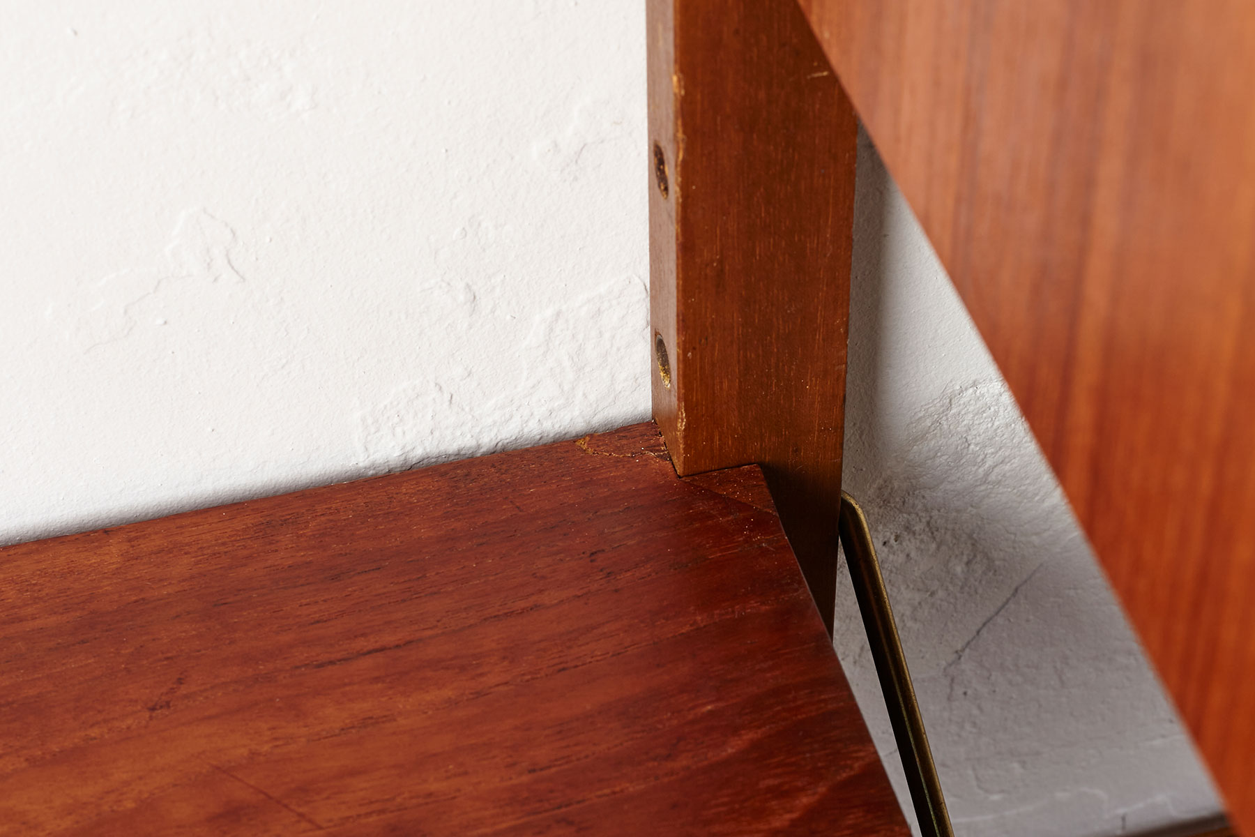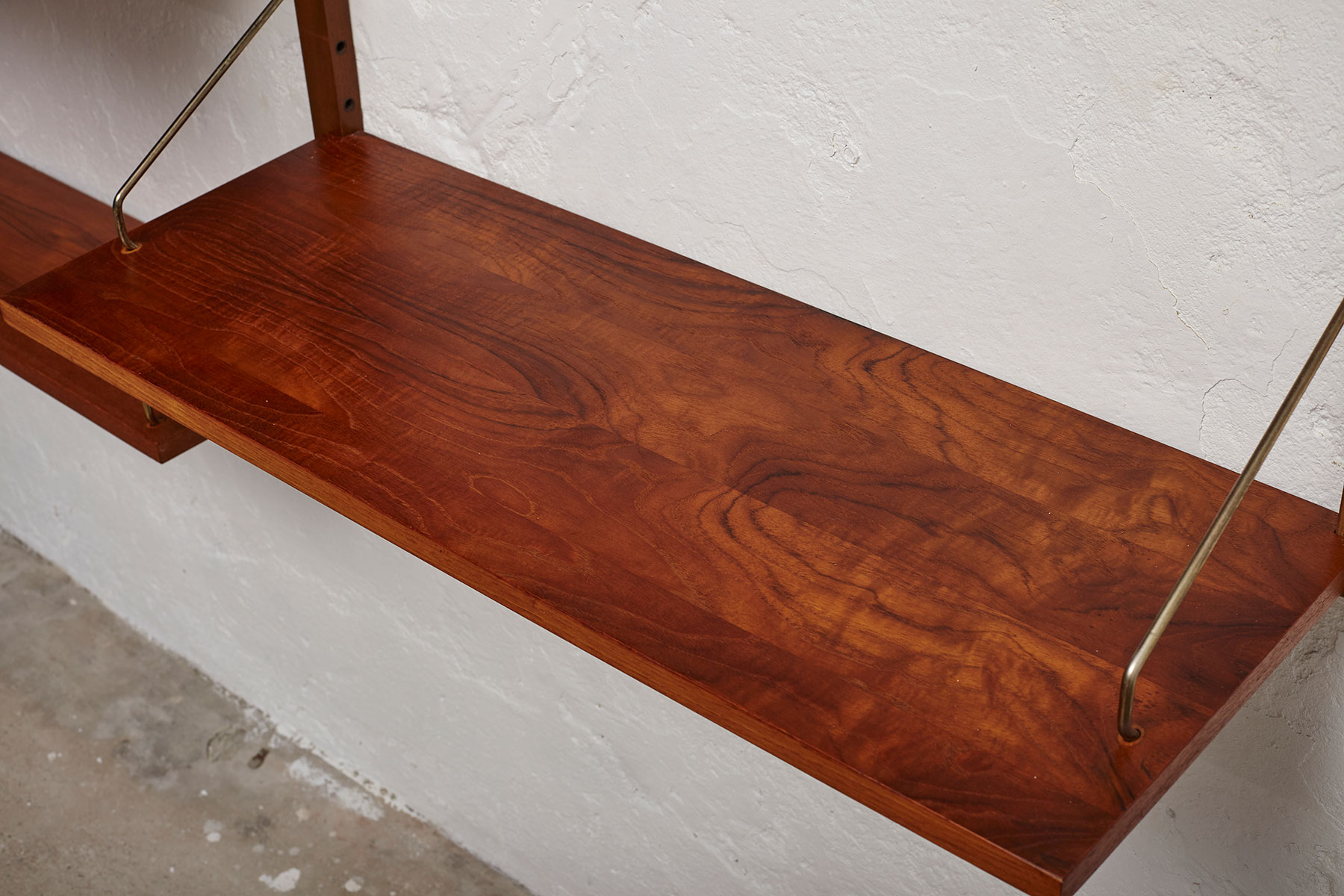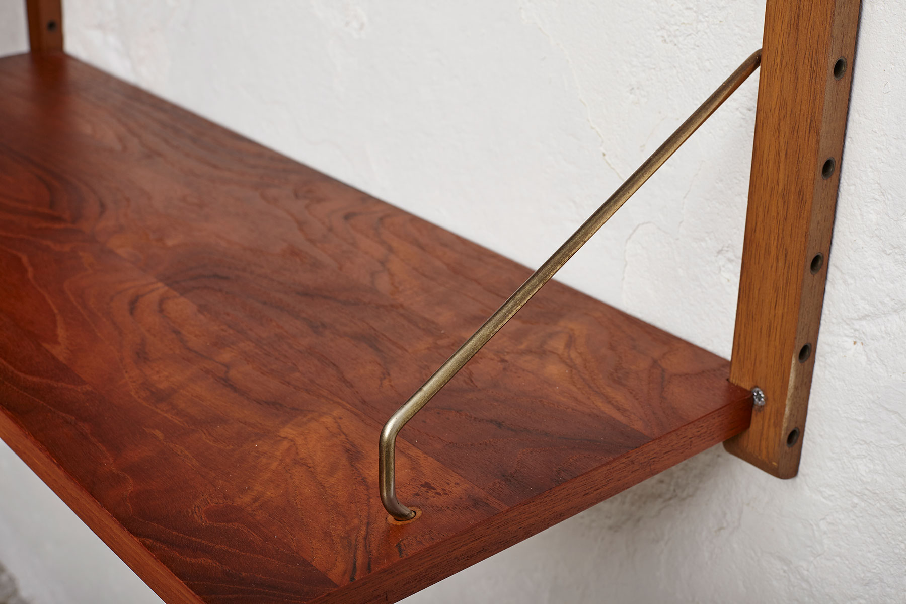 The shelves and cabinets are made from teak veneer, while the wall brackets are solid beech with brass hangers. There are some signs of age-related wear such as veneer repairs, scratches on the cabinets and some shelves, as shown in the photos.