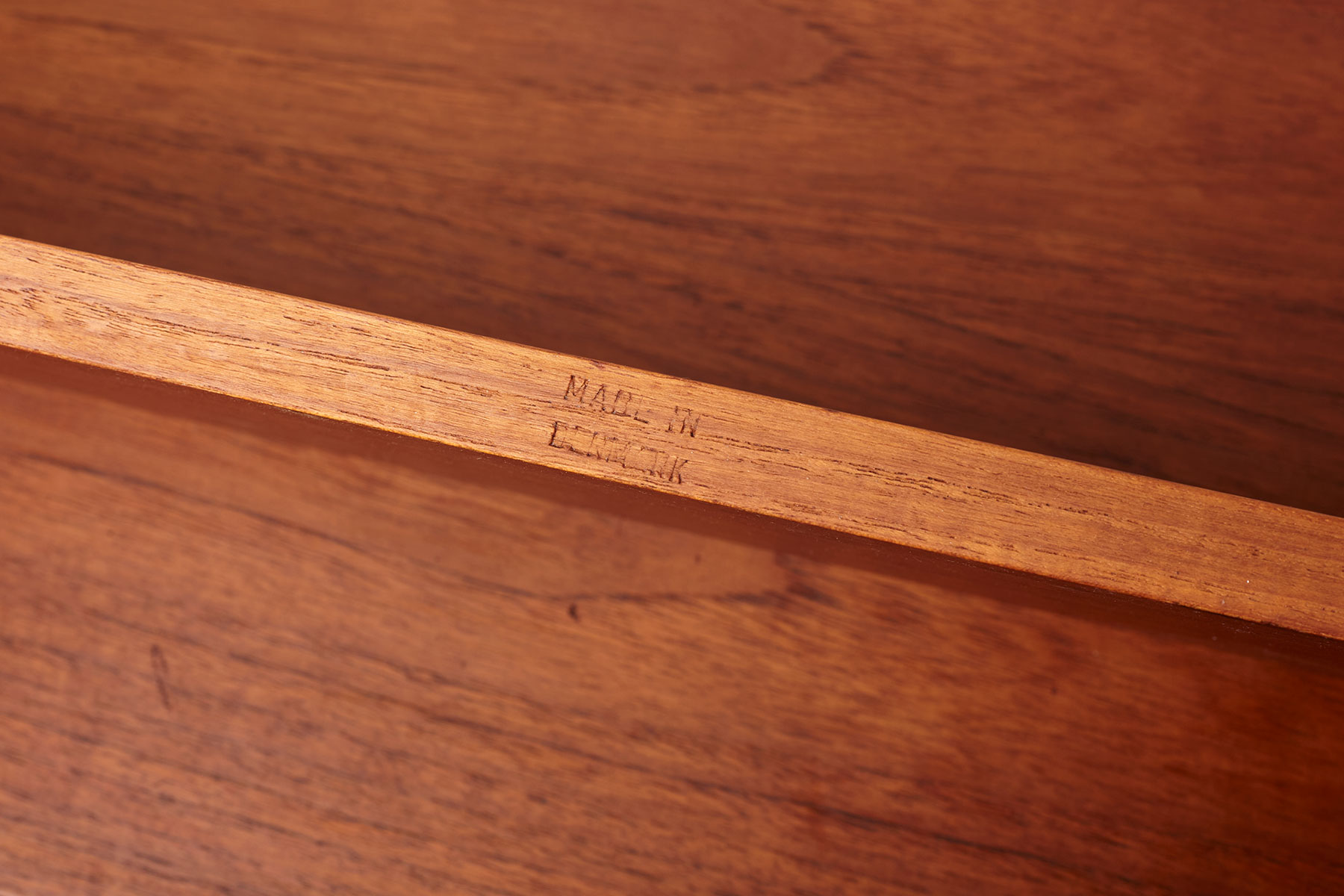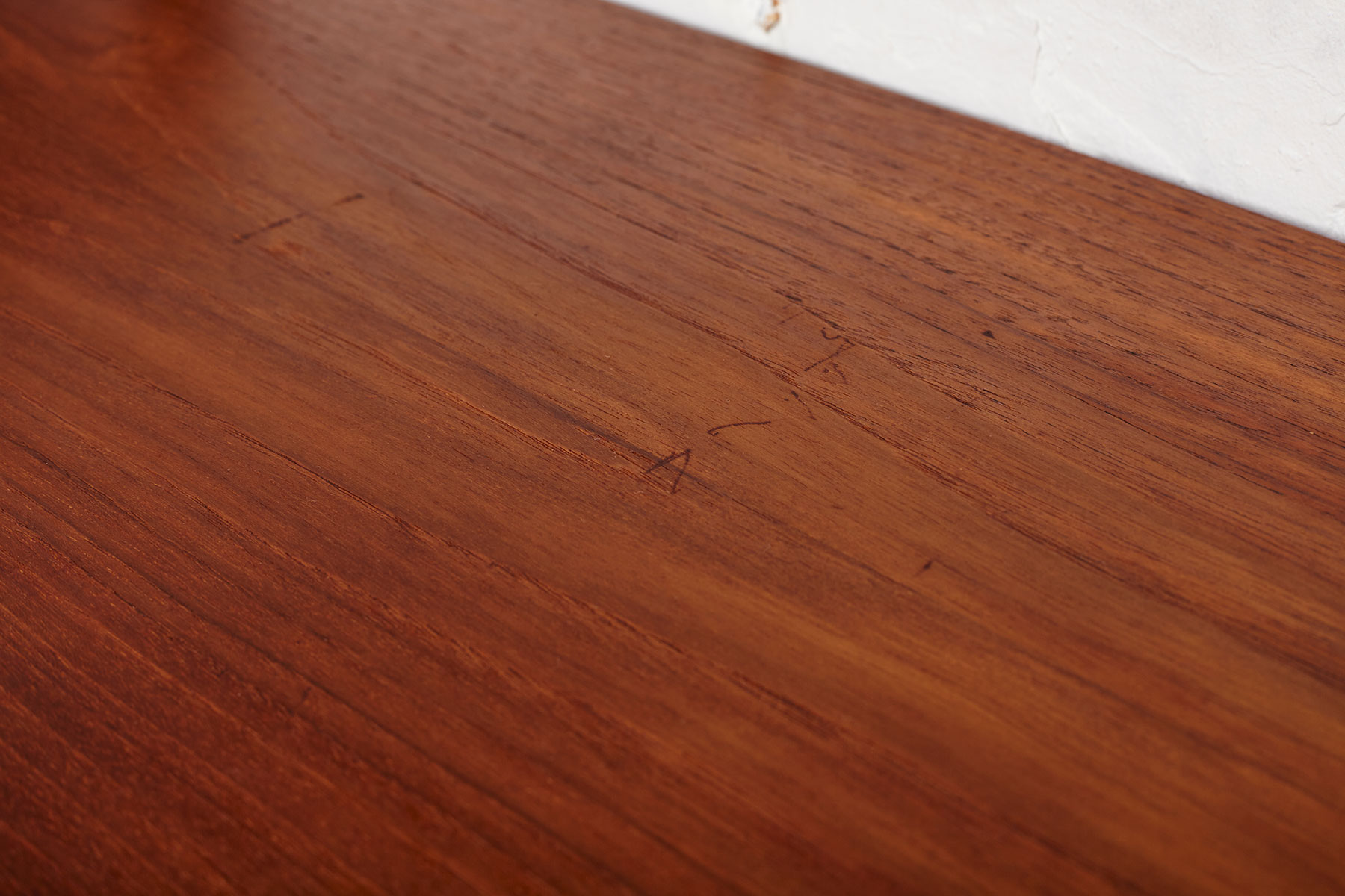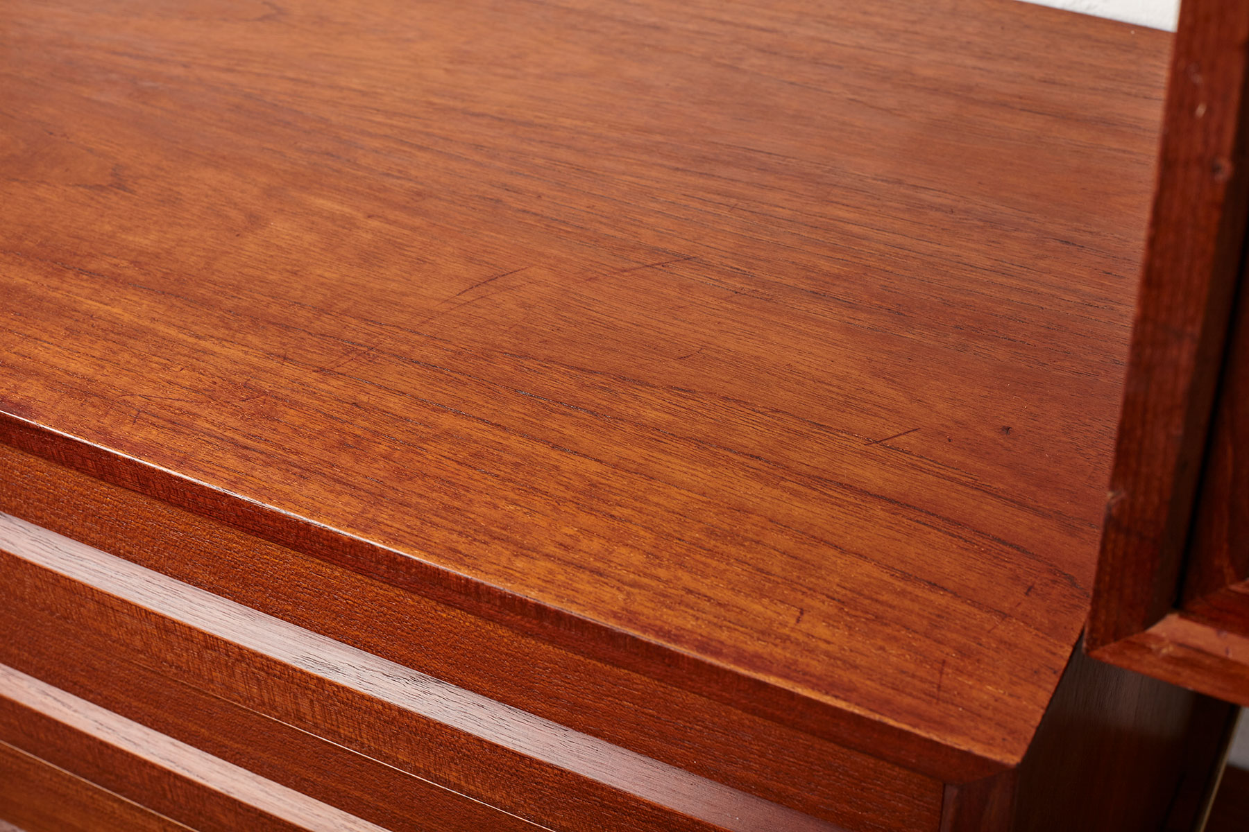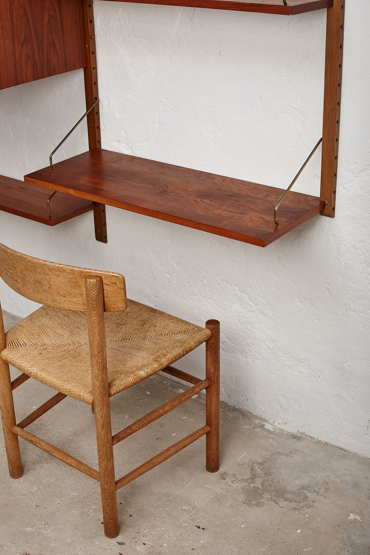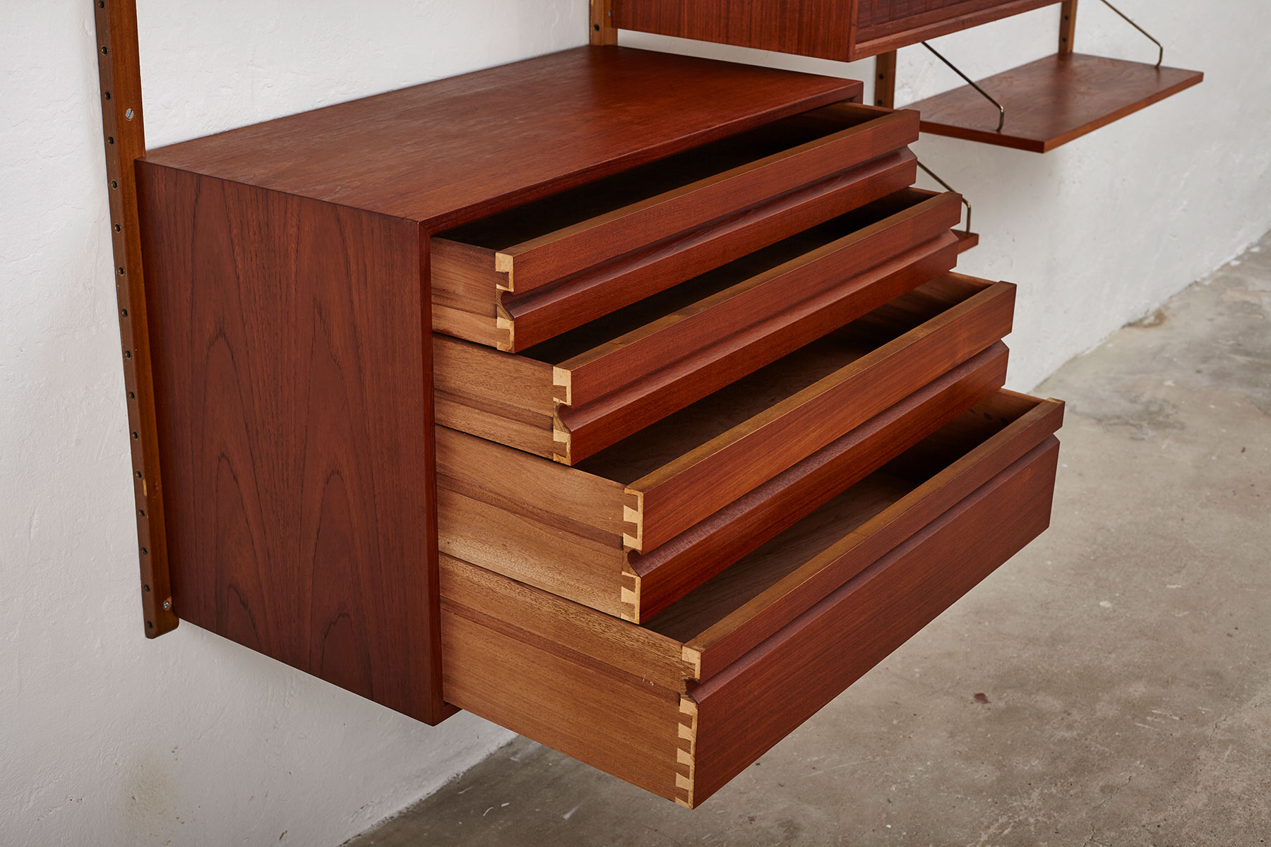 The shelves and cabinets are made from teak veneer, while the wall brackets are solid beech with brass hangers. There are some signs of age-related wear such as veneer repairs, scratches on the cabinets and some shelves, as shown in the photos.