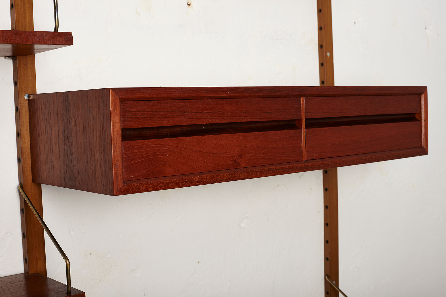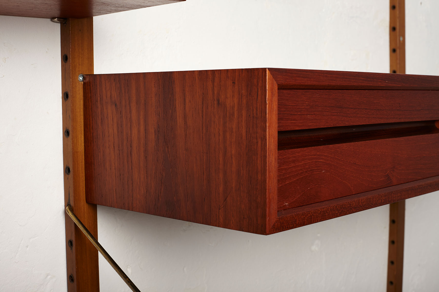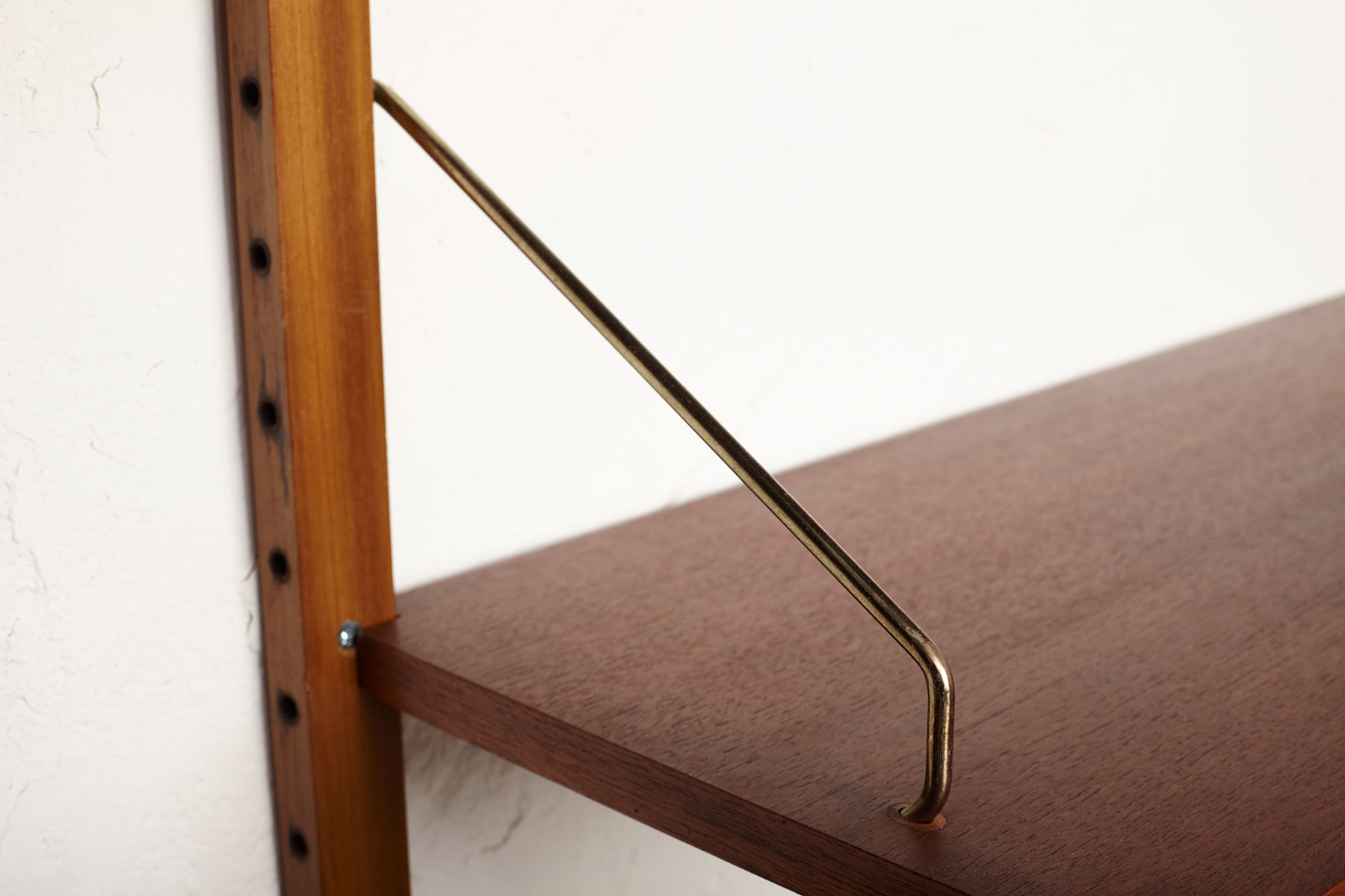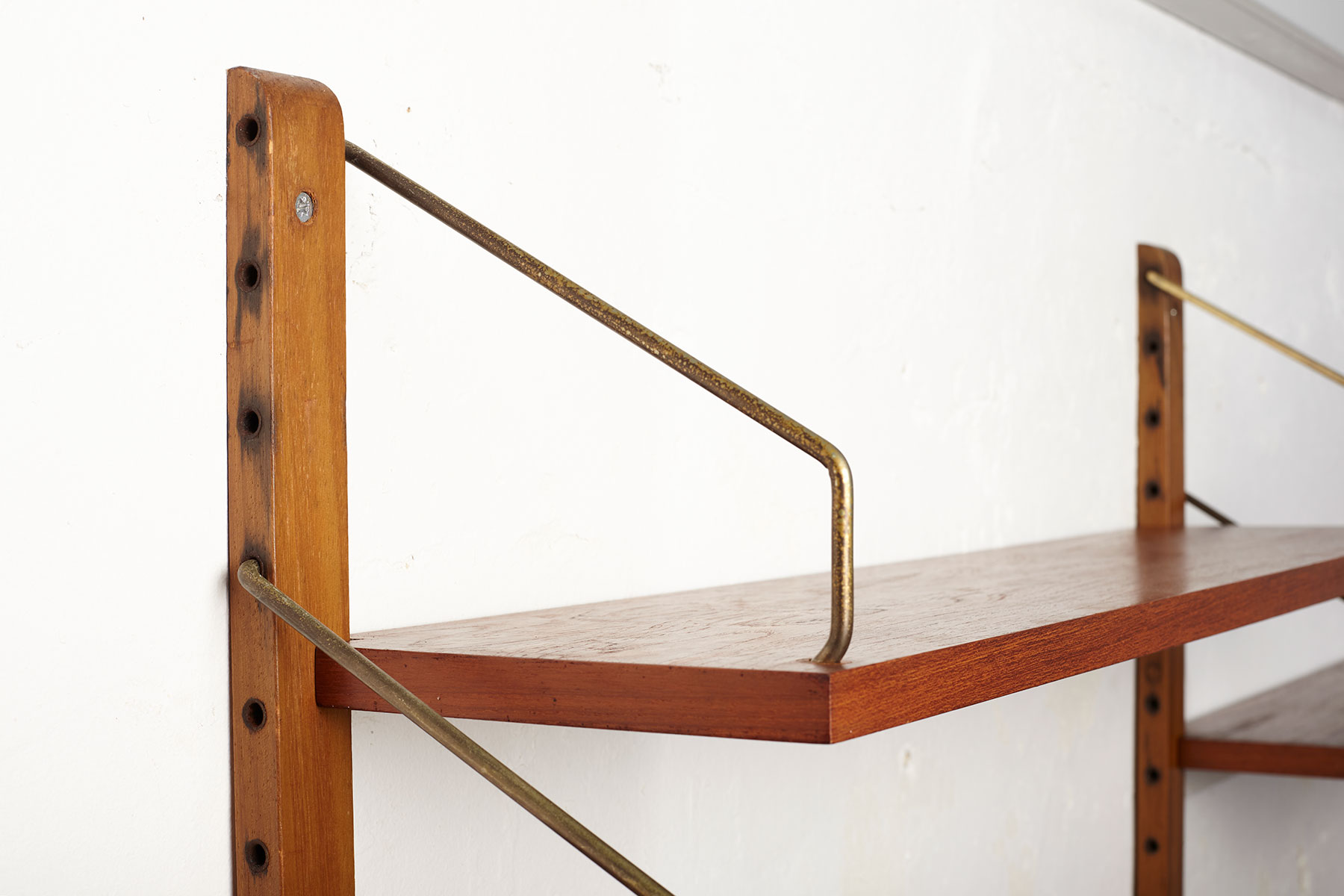 The shelves and cabinets are made from teak veneer, while the wall uprights are solid beech with brass hangers. There are some signs of age-related wear such as veneer repairs, scratches on the cabinets and some shelves and minor rust stain on the tops of two of the wall uprights, as shown in the photos.