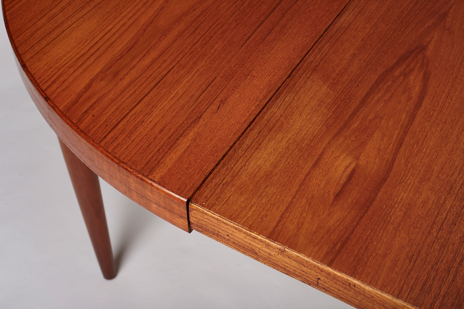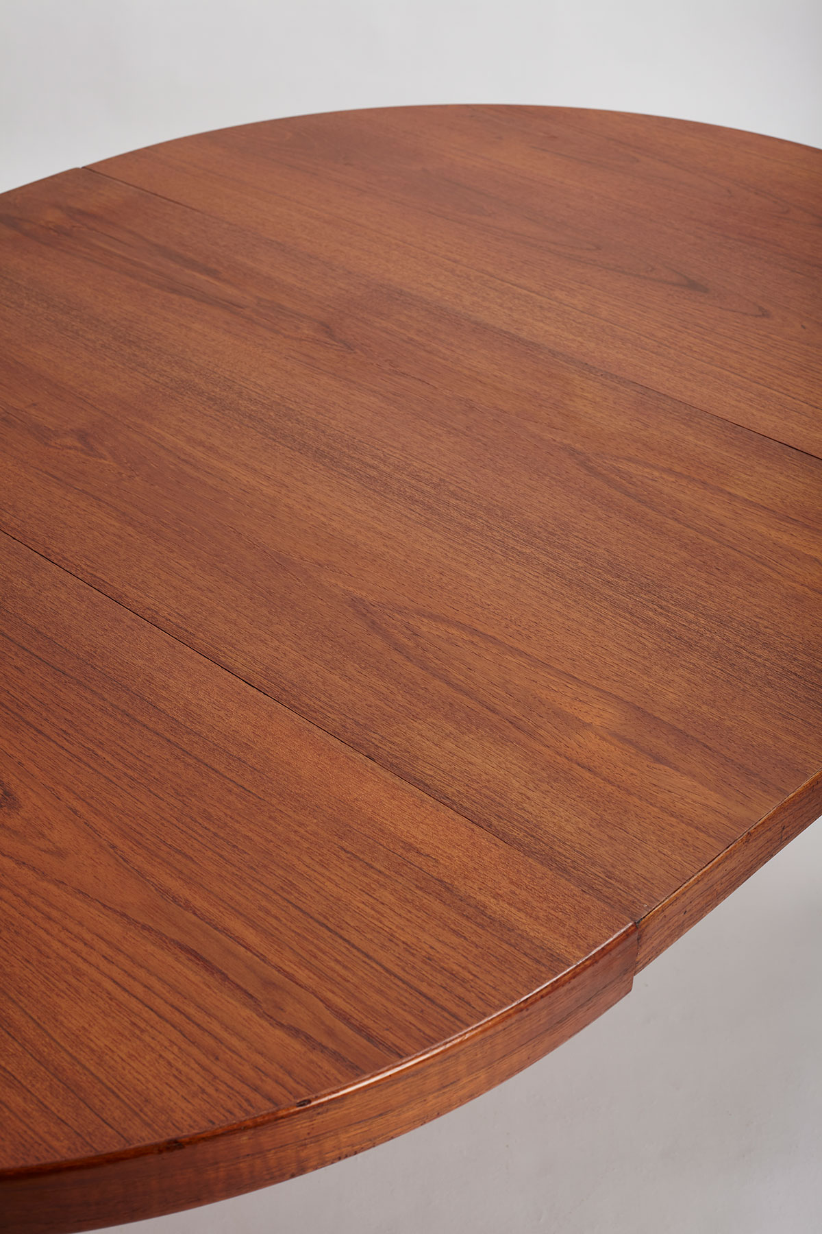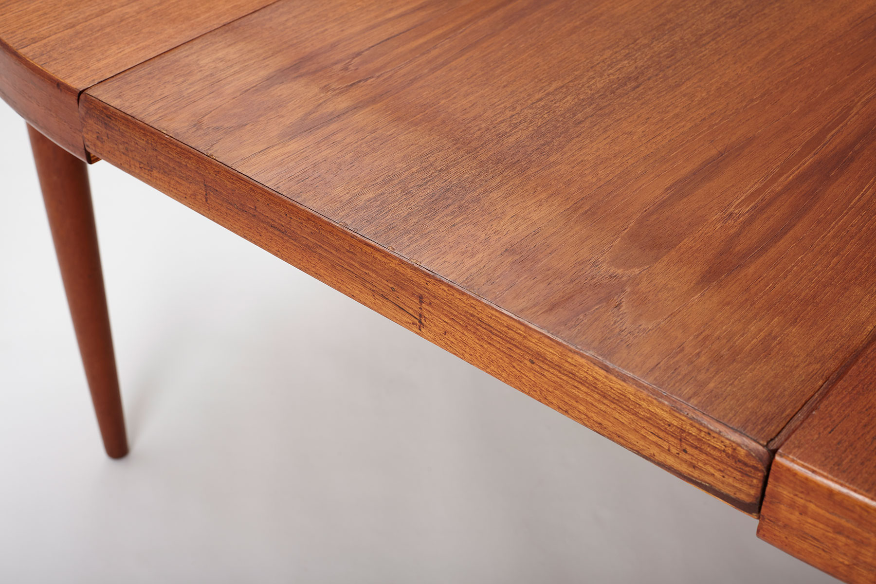 Featuring a teak veneered top and solid teak legs, this table is absolutely beautiful and highly functional. The table comes with one extra extension of 50cm and when fully extended, measures 165cm and can fit 6 people comfortably. Gorgeous wood grain patterns throughout and restored, the top has been stripped, sanded and refinished with a high quality danish oil.