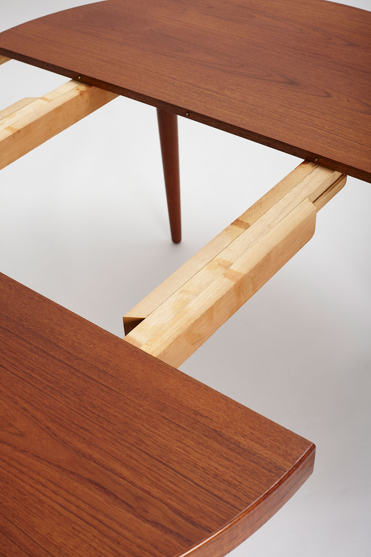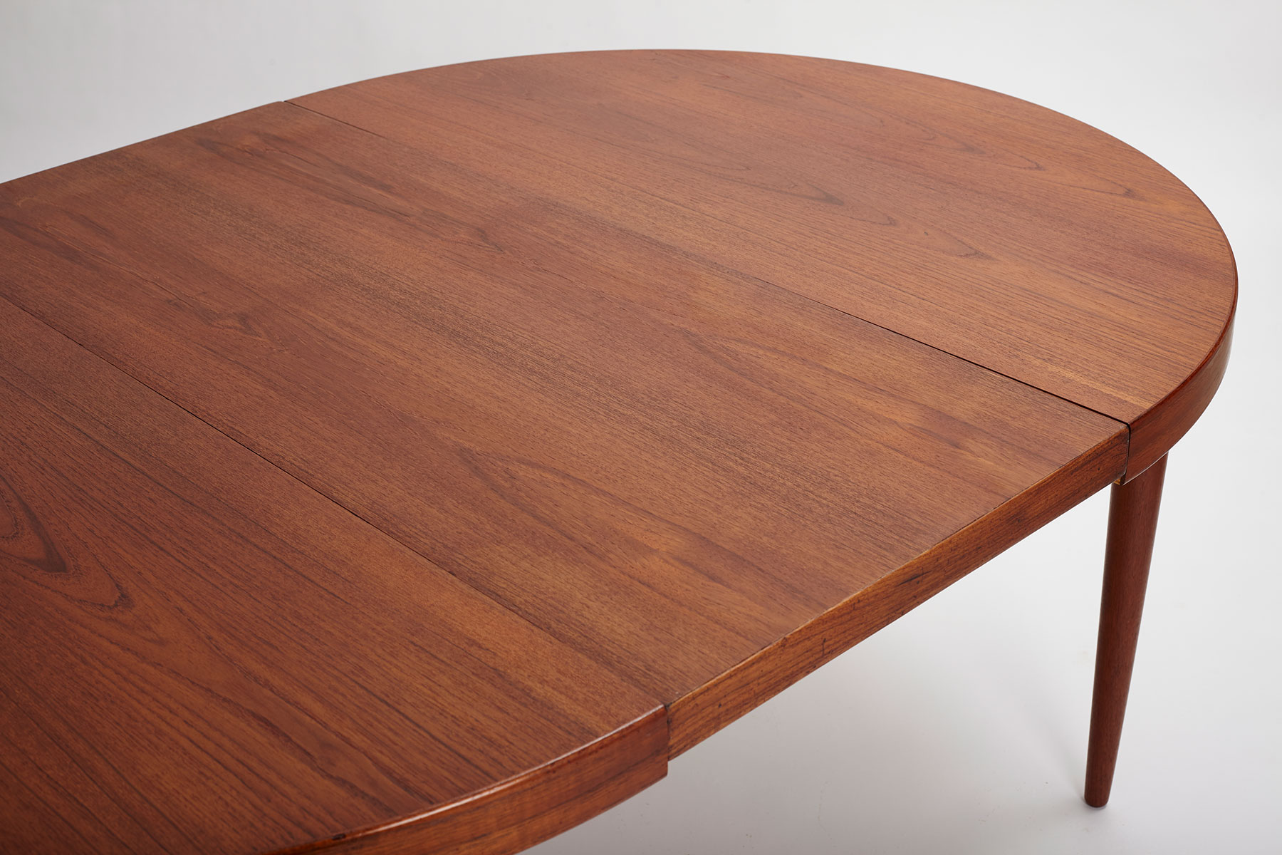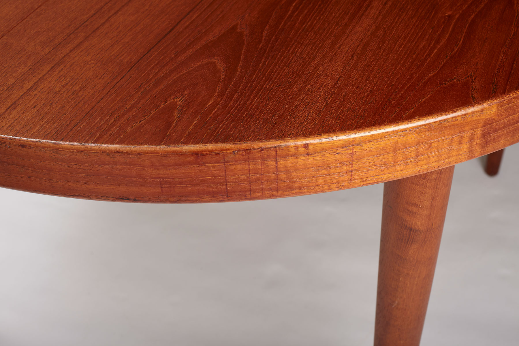 Featuring a teak veneered top and solid teak legs, this table is absolutely beautiful and highly functional. The table comes with one extra extension of 50cm and when fully extended, measures 165cm and can fit 6 people comfortably. Gorgeous wood grain patterns throughout and restored, the top has been stripped, sanded and refinished with a high quality danish oil.
